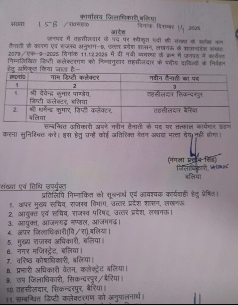 बलिया। जनपद बलिया में एक प्रशासनिक फैसले ने जिले के अफसरशाही गलियारों में हलचल मचा दी है। जिलाधिकारी आईएएस मंगला प्रसाद सिंह ने राजस्व परिषद उत्तर प्रदेश के आदेश के अनुपालन में बड़ा कदम उठाते हुए दो उपजिलाधिकारियों (एसडीएम) को तहसीलदार पद पर तैनात कर दिया है। बताया जा रहा है कि उत्तर प्रदेश में यह पहली बार है, जब किसी जिलाधिकारी द्वारा एसडीएम स्तर के अधिकारियों को तहसीलदार बनाया गया हो।इस निर्णय को लेकर प्रशासनिक और राजनीतिक हलकों में चर्चाओं का दौर तेज हो गया है। लोग इसे व्यवस्था में बदलाव का संकेत मान रहे हैं, तो कुछ इसे कड़े प्रशासनिक संदेश के रूप में देख रहे हैं।प्राप्त जानकारी के अनुसार—🔹 पीसीएस देवेंद्र कुमार पांडेय (2019 बैच, डिप्टी कलेक्टर) को तहसीलदार सिकंदरपुर नियुक्त किया गया है।🔹 पीसीएस धर्मेंद्र कुमार (2024 बैच, डिप्टी कलेक्टर) को तहसीलदार बैरिया की जिम्मेदारी सौंपी गई है।सूत्रों का कहना है कि इस फैसले से राजस्व प्रशासन में कार्यकुशलता बढ़ाने और जवाबदेही तय करने का संदेश दिया गया है। वहीं, जिले में यह चर्चा भी जोरों पर है कि आगे इस तरह के और फैसले देखने को मिल सकते हैं।फिलहाल डीएम के इस कदम को लेकर जिले भर में चर्चाएं गर्म हैं और सभी की निगाहें आने वाले दिनों में प्रशासनिक गतिविधियों पर टिकी हुई हैं।