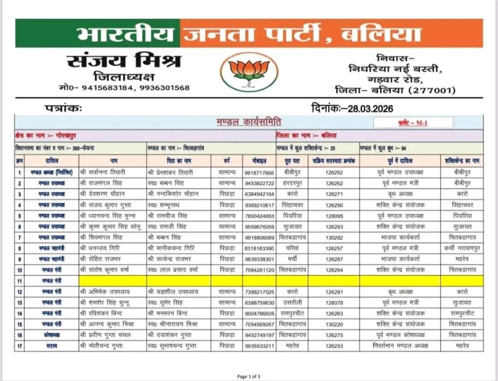 बलिया (चितबड़ागांव)। भारतीय जनता पार्टी, बलिया के जिलाध्यक्ष संजय मिश्रा ने चितबड़ागांव मंडल की नई कार्यसमिति की घोषणा कर संगठन में नई ऊर्जा का संचार किया है। घोषित सूची में अनुभवी और युवा कार्यकर्ताओं का संतुलन देखने को मिला, जिससे स्थानीय स्तर पर उत्साह का माहौल है।नई कार्यसमिति के तहत सर्वानंद तिवारी को मंडल अध्यक्ष (नियुक्ति) की जिम्मेदारी सौंपी गई है। वहीं राजमंगल सिंह, देवशरण चौहान, संजय कुमार गुप्ता, ध्रुवप्रताप सिंह मुन्ना, कृष्ण कुमार सिंह सोनू एवं शिवमंगल सिंह को मंडल उपाध्यक्ष बनाया गया है।